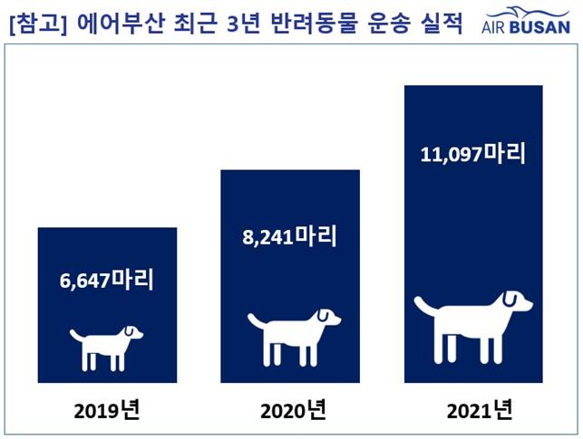 이는 지난해 8천241마리보다 약 3천 마리가 증가한 것으로 전년 대비 35%나 증가한 수치다. 에어부산에 따르면 2019년부터 본격적으로 반려동물 동반 탑승이 늘어났으며 그에 따라 항공기 당 반려동물 운송 수도 늘어나고 있다고 전했다.