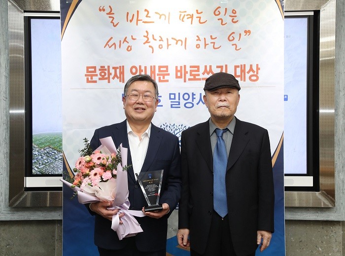 진흥원은 밀양시가 시민과 관광객이 읽는 문화재 안내문에 알기 쉽고 정확한 글을 선보이며 모범을 보였기에 이 상을 시상한다고 취지를 설명했다.