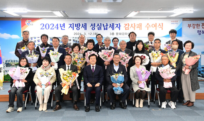 진주시는 12일 시청 문화강좌실에서 지방세 납부에 대한 시민의식을 높이고 건전한 납세문화 조성을 위한 ‘성실납세자 감사패 수여식’을 개최했다.