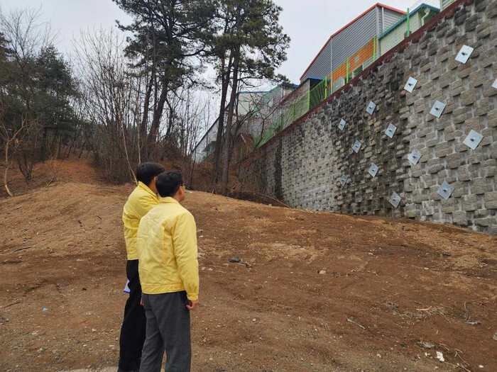 | ▲ 윤성진 화성특례시 제1부시장이 해빙기 급경사지 붕괴위험지역을 찾아 옹벽 상태를 점검하고 있다 /사진제공=화성특례시 |