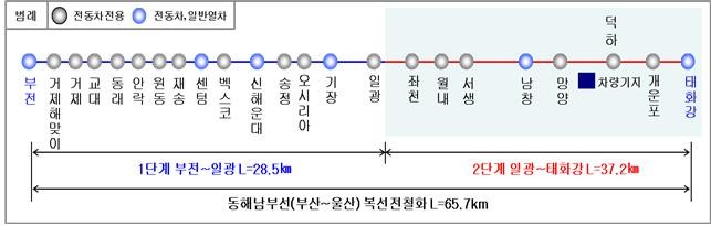 부산과 울산을 잇는 복선전철인 동해선은 총사업비 2조 8,270억 원이 투입됐으며, 지난 2003년부터 추진됐다. 전체 65.7km, 23개 역 중 2016년 1단계 구간인 부전~일광 28.5km, 15개 역이 먼저 개통됐고, 이번에 2단계 구간인 일광~태화강 37.2km, 8개 역이 개통하게 됐다.