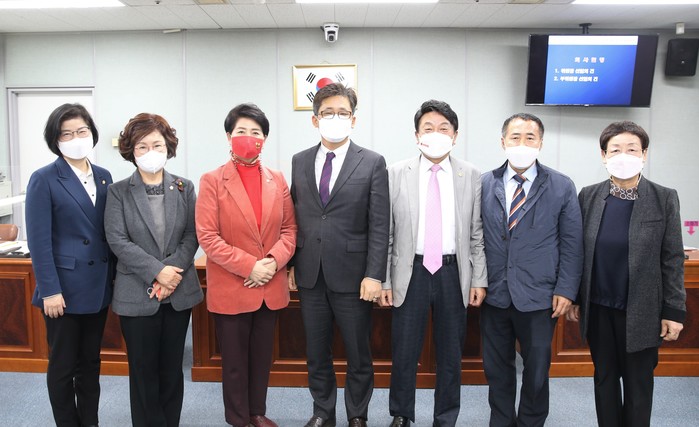 | ▲ 강철웅 위원장(가운데), 조미애 부위원장(왼쪽 세 번째)을 비롯한 예결특위 위원들이 기념촬영을 하고 있다.(사진제공=도봉구의회) |