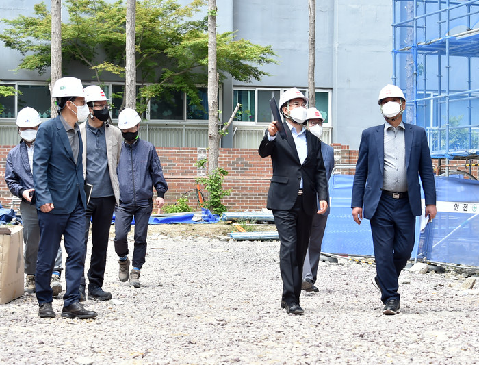 오승현 부산광역시교육감 권한대행이 2일 기장군 기장중학교와 해운대구 해운대초등학교를 잇따라 방문해 개축공사 현장을 점검하고, 학교 관계자들의 애로사항을 청취하고 있다.