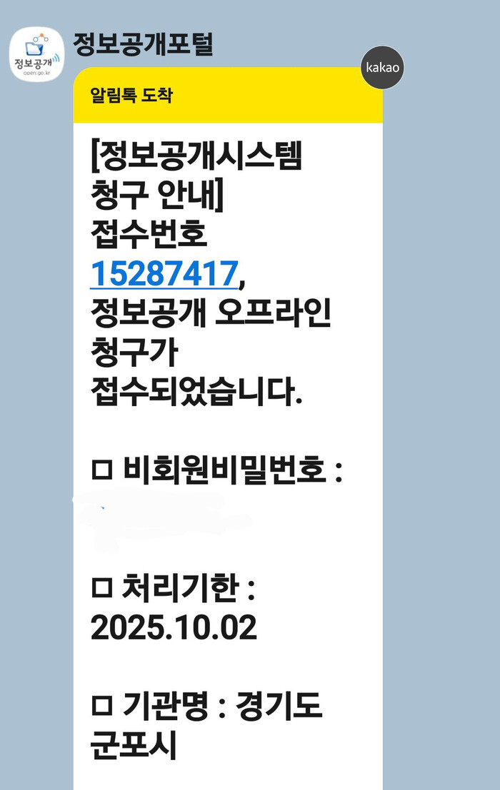 | ▲ 군포시가 보낸 정보공개 청구에 대해 알림톡 내용 |