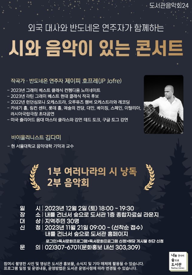 시와 음악이 있는 콘서트에 대한 자세한 사항은 도서관 홈페이지를 통해 확인하거나 내를건너서숲으로도서관으로 전화 문의하면 된다.