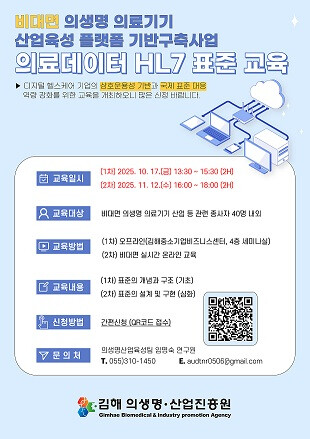 교육 과정은 HL7 Korea의 전문 교육 콘텐츠와 우수한 강사진을 기반으로 진흥원과 공동으로 기획·운영되며 전 과정이 무료로 제공된다. 이를 통해 수도권 중심의 고급 교육 인프라를 김해시로 확산시키고, 산업 종사자들의 표준 적합성 역량을 강화함으로써 기업의 국제 표준 대응 경쟁력 제고에 실질적 기여가 기대된다.