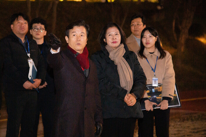 조규일 진주시장은 지난 13일 진주성 촉석문 아래 옹벽 정비 후 설치된 경관조명 준공에 앞서 공무원 등 관계자 10여 명과 함께 현장을 찾아 최종 점검했다.
