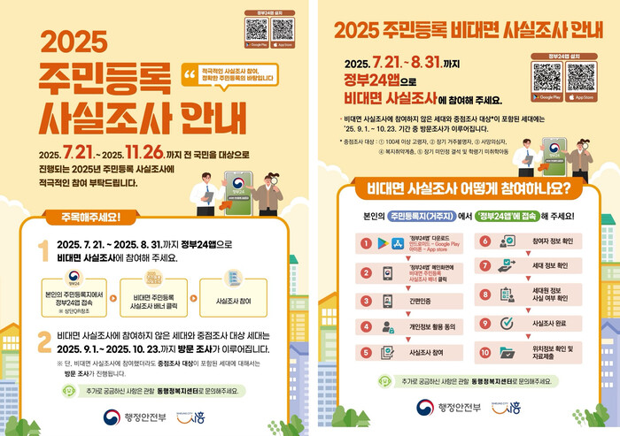 이번 사실조사는 1단계 비대면 디지털 조사와 2단계 방문 조사를 병행해 추진된다. 먼저 7월 21일부터 8월 31일까지는 ‘정부24’ 앱을 통한 비대면 조사가 진행되며, 9월 1일부터 10월 23일까지는 통장 및 동 주민센터 담당 공무원이 직접 세대를 방문해 현장 확인 조사를 한다.