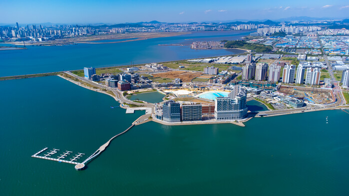 | ▲시화호와 거북섬 전경, 거북섬에서 시화호로 뻗어나가는 경관브릿지와 마리나 시설이 눈에 띈다 /사진제공=시흥시 |
