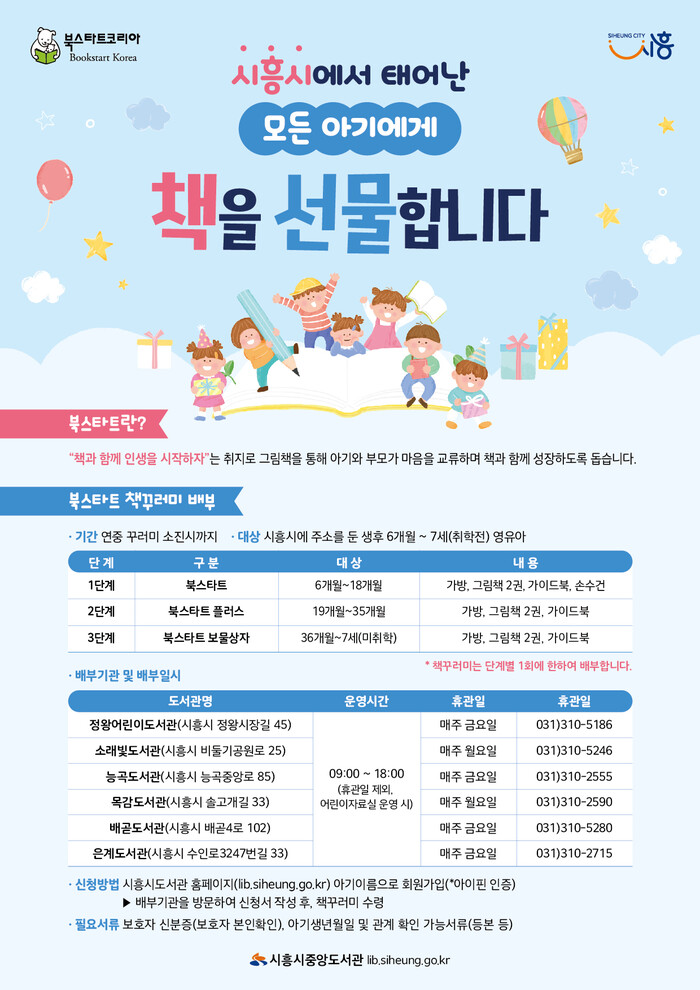 신청은 관내 6개 도서관(정왕어린이ㆍ은계ㆍ목감ㆍ능곡ㆍ배곧ㆍ소래빛)에서 가능하다. 보호자가 신분증과 주민등록등본 등 아동 연령을 확인할 수 있는 서류를 지참해 방문 신청하면 된다. 배부는 선착순으로 진행되며, 준비 수량 소진 시 조기 마감될 수 있다.