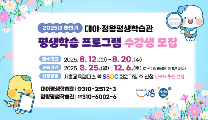 [시흥=송윤근 기자] 경기 시흥시 대야ㆍ정왕평생학습관에서 2025년 하반기 평생학습프로그램 수강생을 모집한다. 이번 하반기 프로그램은 오는 8월 25일부터 10~12주간 운영되며, 연령과 수요를 반영한 실용적이고 다채로운 강좌로 구성됐다.