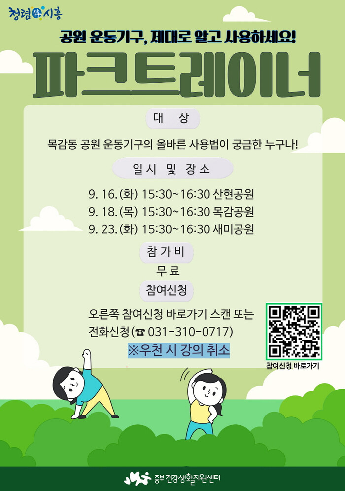 또한, 9월 26일 능곡동 신안인스빌, 10월 17일 장현동 LH18단지 운동기구 존에서 오후 4시부터 한 시간씩 건강아파트 주민을 대상으로 ‘찾아가는 파크트레이너’ 프로그램을 운영할 예정이다.