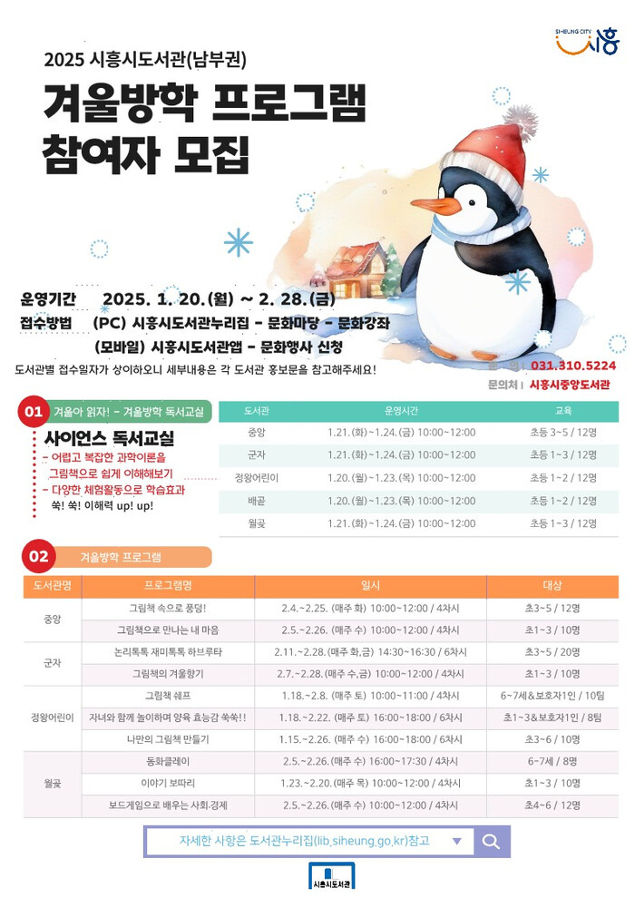 [시흥=송윤근 기자] 경기 시흥시(시장 임병택) 중앙도서관을 비롯한 남부권 5개 공공도서관(중앙, 군자, 정왕어린이, 배곧, 월곶)이 겨울방학을 맞아 겨울 독서교실과 겨울방학 프로그램을 내년 1월 20일부터 2월 28일까지 운영한다.