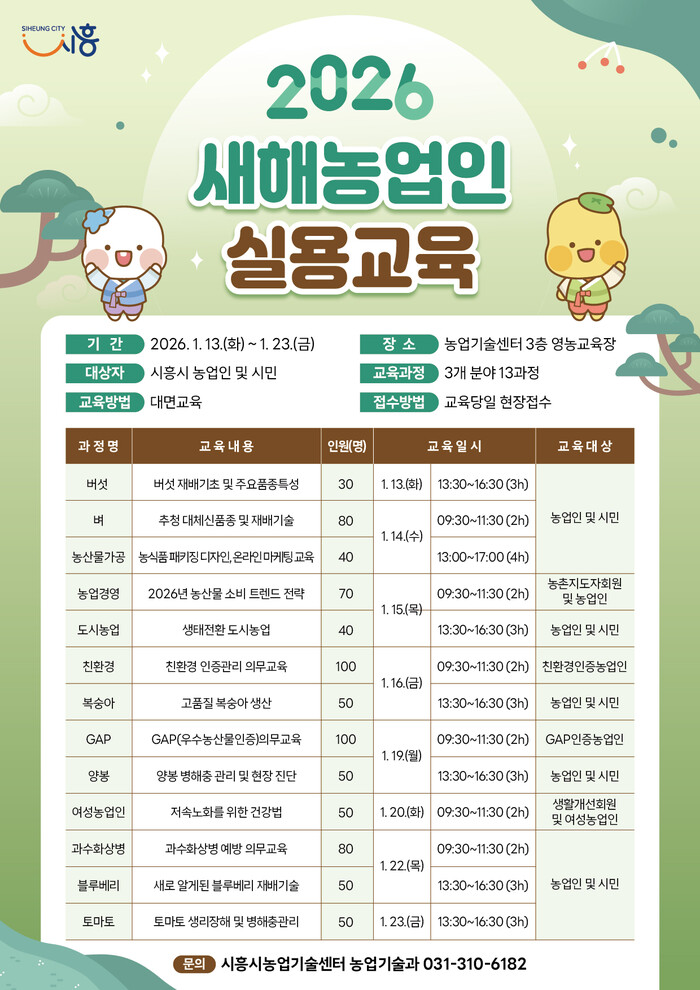 농업인 970여 명을 대상으로 진행되는 이번 교육은 작물별 전문농업기술 교육과 병해충 예방 교육 등 총 3개 분야 13개 과정으로 구성됐다. 특히 최신 농업정보와 시흥시 농업 동향을 안내하는 과정을 함께 운영해 농업인들에게 실질적인 도움이 되도록 진행된다.