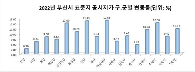 특히, 재개발, 재건축 등 개발 이슈가 많은 해운대구, 남구, 수영구, 부산진구에서 각각 12.55%(전년 13.42%), 12.43%(전년 13.76%), 12.06%(전년 11.86%), 12.00%(전년 12.51%)의 상승률을 나타내며 평균 공시지가를 끌어올렸다.