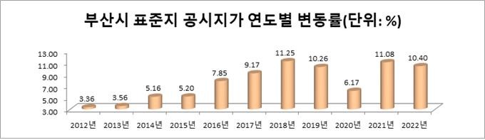 부산시(시장 박형준)는 2022년 1월 1일 기준 부산지역 표준지 공시지가*가 평균 10.40% 상승했다고 밝혔다.