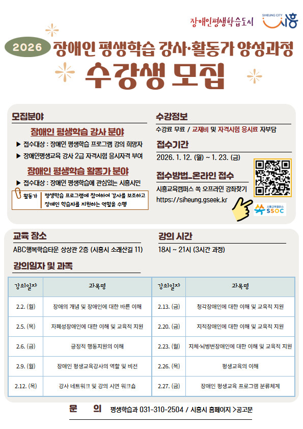 | ▲ ‘2026년 장애인 평생학습 전문 강사와 활동가 양성 과정’ 수강생 모집 안내 포스터 /자료제공=시흥시 |