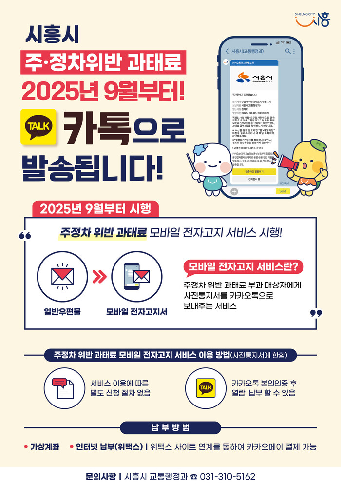 [시흥=송윤근 기자] 경기 시흥시(시장 임병택)는 오는 9월부터 ‘주정차 위반 과태료’ 고지서를 전자문서(카카오톡)로 발송하는 ‘모바일 전자고지 서비스’를 정식으로 운영한다.