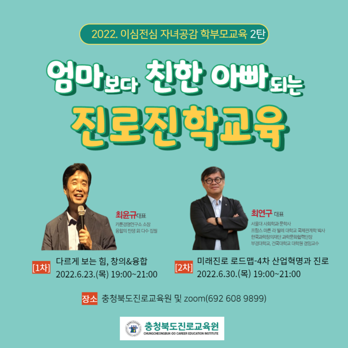 2회 차는 30일(목) 19시에 열린다. 사교육 없이 자녀를 서울대 공대에 보낸 ‘미래교육 전문가 아빠가 전하는 최적의 진로설계법’에 대한 내용으로 최연구 부경대 교수의 강연이 있을 예정이다.