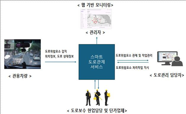 ‘스마트도로관리시스템’은 공용차량에 사물 인식 카메라를 탑재해 도로 주행 중 도로 파임(포트홀) 등 위험 요인을 실시간으로 감지하고, 이를 담당자에게 자동 전송해 신속한 보수가 이뤄지도록 연계하는 체계다. 이후 관내 도로유지관리 업체가 24시간 이내 현장에 출동해 보수하는 구조로 운영된다.