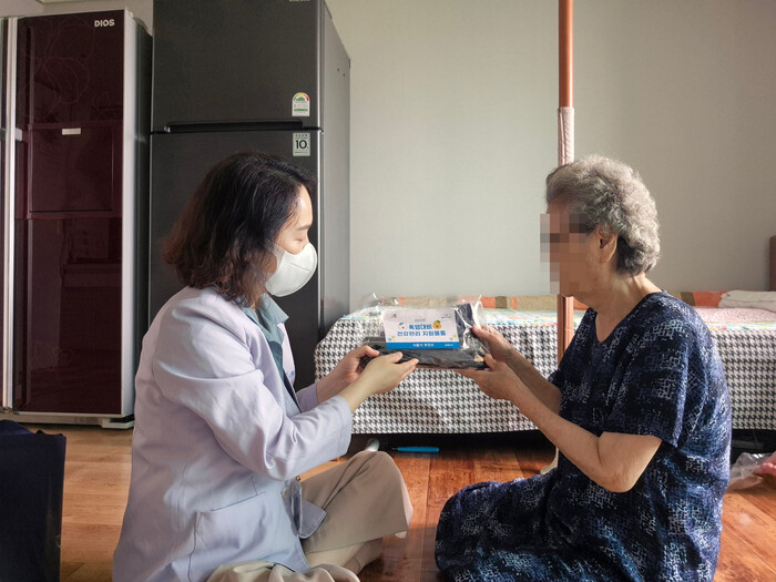 | ▲ 방문간호사가 건강취약계층 어르신에게 폭염 대비 물품을 배부하고 있다 /사진제공=시흥시 |