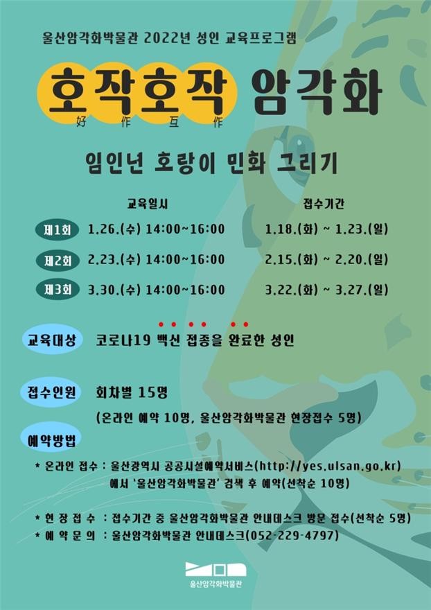 또한 울산암각화박물관은 1월부터 3월까지는 작은 전시 ‘반구대 호(虎)전’과 연계하여 민화 호랑이를 그려 보는 성인 대상 교육프로그램 ‘호작호작(好作互作) 암각화’를 운영한다.