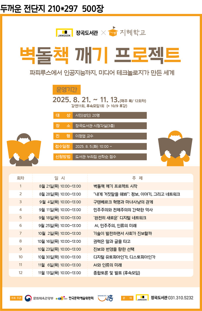 [시흥=송윤근 기자] 경기 시흥시장곡도서관은 오는 8월 21일부터 11월 13일까지 매주 목요일 오전 10시부터 오후 1시까지 총 12회에 걸쳐 인문학과 예술에 관심 있는 지역 주민을 대상으로 ‘2025년 지혜학교-벽돌책 깨기 프로젝트’를 진행한다.
