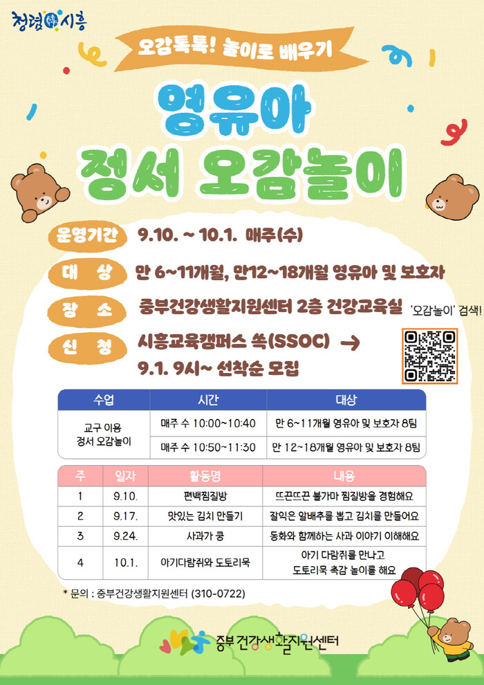 교육은 만 6~11개월, 12개월~18개월 영유아 및 보호자를 대상으로 운영하며, 중부건강생활지원센터 2층 건강교육실에서 진행된다. 각 회차별 8팀씩 모집하며 시흥교육캠퍼스(SSOC) 시스템을 통해 9월 1일부터 신청할 수 있다. 신청 인원이 마감된 경우 대기 신청도 가능하다.
