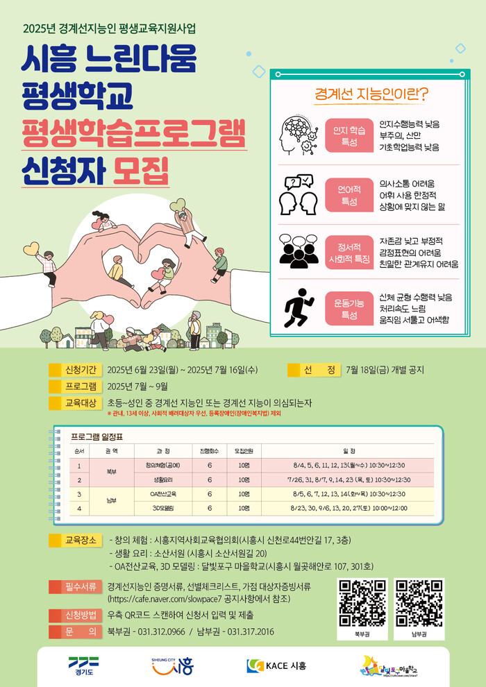[시흥=송윤근 기자] 경기 시흥시(시장 임병택)는 2025년 경계선 지능인 평생교육 지원사업인 ‘시흥 느린다움 평생학교’의 선별검사에 이어, 6월 23일부터 7월 16일까지 평생학습 프로그램 참여자를 모집한다.