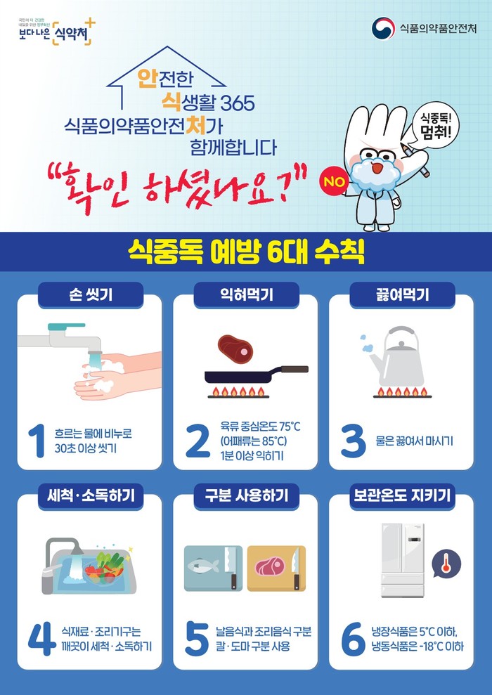 식중독을 예방하기 위해 꼭 알아두어야 할 6대 수칙으로는 ▲손 씻기(흐르는 물에 비누로 30초 이상 씻기) ▲익혀먹기(중심온도 육류 75℃·어패류 85℃로 1분 이상 익히기) ▲끓여먹기(물은 끓여서 마시기) ▲세척·소독하기(식재료·조리기구는 깨끗이 세척·소독하기) ▲구분 사용하기(날음식과 조리음식 구분하여 칼·도마 사용) ▲보관 온도 지키기(냉장식품은 5℃이하, 냉동식품은 –18℃ 이하)이다.