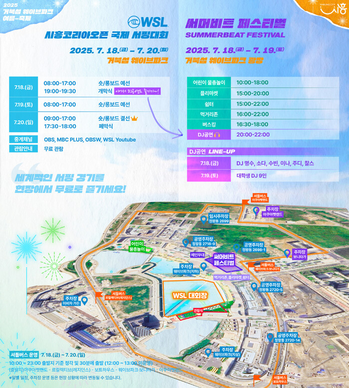 대회와 연계해 시흥시가 시민들이 즐길 수 있게 마련한 다양한 문화행사와 체험 프로그램도 눈길을 끈다. 18일부터 19일까지 이틀간 거북섬 웨이브파크 특설광장에서는 디제잉 축제인 ‘2025 시흥 써머비트 페스티벌’이 열려 박명수, 소다 등이 선보이는 디제이(DJ) 공연, 버스킹 등 다채로운 공연이 밤마다 이어진다.