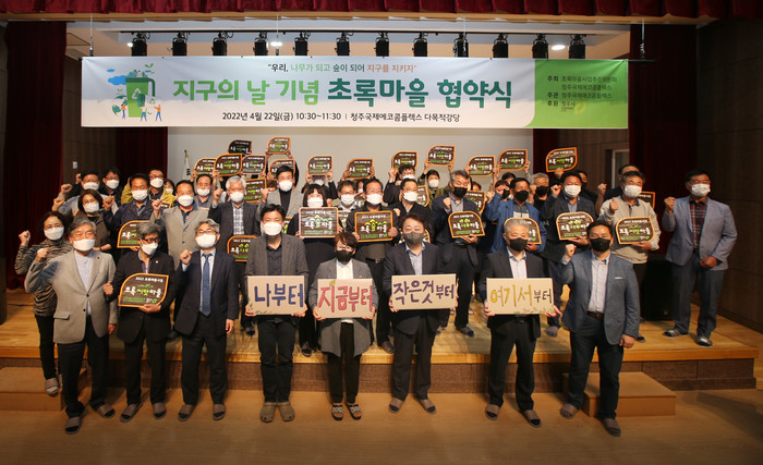청주시와 청주국제에코콤플렉스, 초록마을사업추진위원회는 22일 청주국제에코콤플렉스에서 ‘지구의 날’을 기념하며 올 한 해 동안 초록마을사업에 참여할 40개소의 마을주민과 추진위원 등 100여명이 참석한 자리에서 초록마을 협약식을 개최했다.