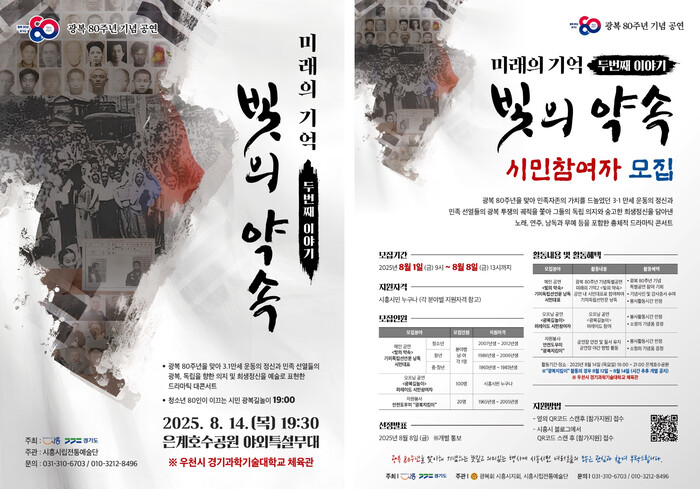 [시흥=송윤근 기자] 경기 시흥시(시장 임병택)는 오는 8월 14일 오후 7시 30분 은계호수공원 야외 특설무대에서 시흥시립전통예술단 광복 80주년 기념 특별공연 ‘미래의 기억 II : 빛의 약속’을 개최한다.