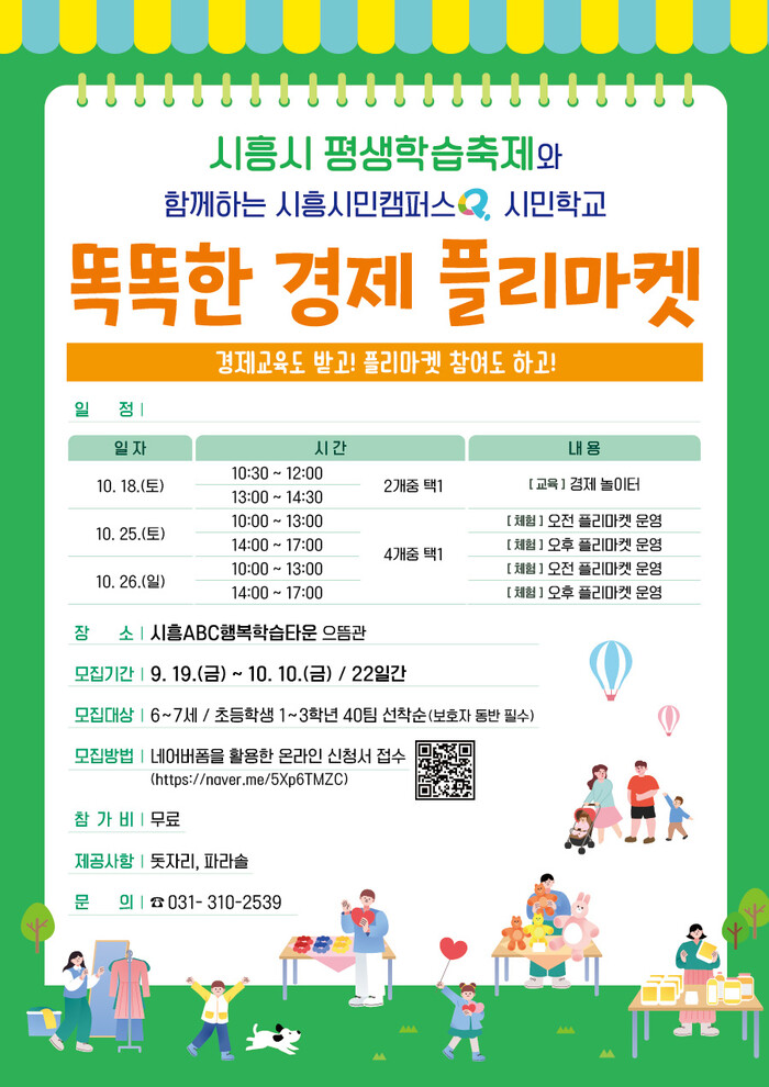 [시흥=송윤근 기자] 경기 시흥시(시장 임병택)는 제17회 시흥시평생학습축제(10월 24일~26일)와 연계해 어린이들의 경제활동 이해 증진과 가족 간 소통 강화를 위한 ‘똑똑한 경제 플리마켓’을 오는 10월 18일부터 시흥ABC행복학습타운 으뜸관에서 추진한다.