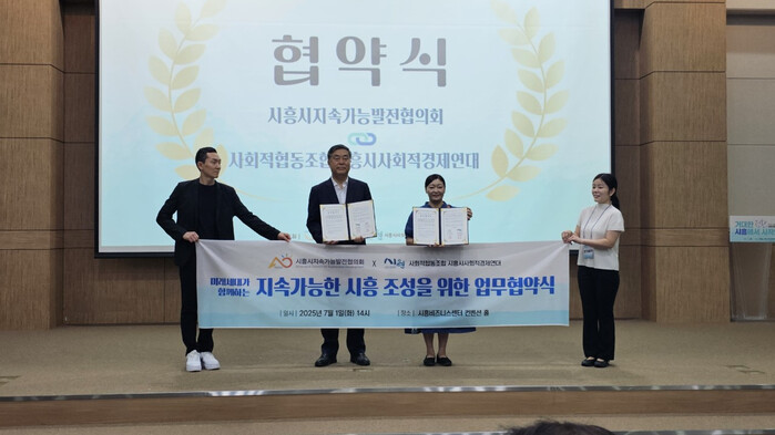 [시흥=송윤근 기자] 경기 시흥시지속가능발전협의회와 사회적협동조합 시흥시사회적경제연대는 지난 7월 1일 시흥비즈니스센터에서 지속가능한 사회적경제 생태계 조성과 지속가능발전에 대한 인식을 높이고 양 기관의 상호 발전을 도모하기 위한 업무협약을 체결했다.