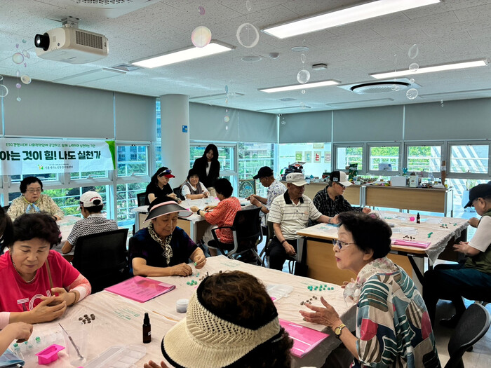 참여 어르신들은 커피 추출 후 남은 찌꺼기와 천연재료를 혼합해 지구 모양 비누를 제작하며, 버려지는 물건에 새로운 가치를 부여하는 ‘새활용’과 환경보호의 중요성을 직접 체험했다.