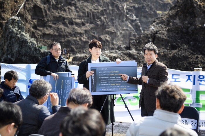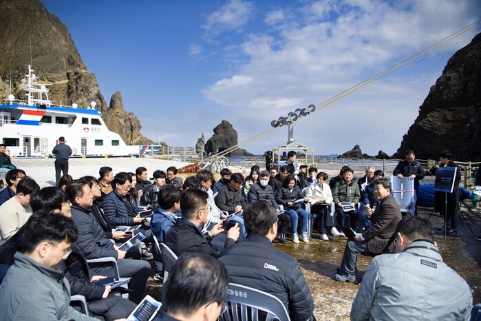 [울릉=백광태 기자] 경북 울릉군은 지난 27일(월) 독도(동도 물양장)에서 울릉도‧독도 지원 특별법 제정을 기원하기 위한 2023년 독도 현장 부서장 회의를 개최했다.