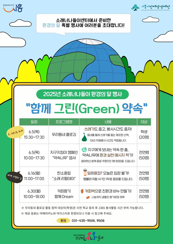 [시흥=송윤근 기자] 경기 (재)시흥시인재양성재단 학교복합시설 소래너나들이센터가 6월 5일부터 30일까지 지역주민을 대상으로 ‘함께 그린(Green) 약속’ 행사를 운영한다.
