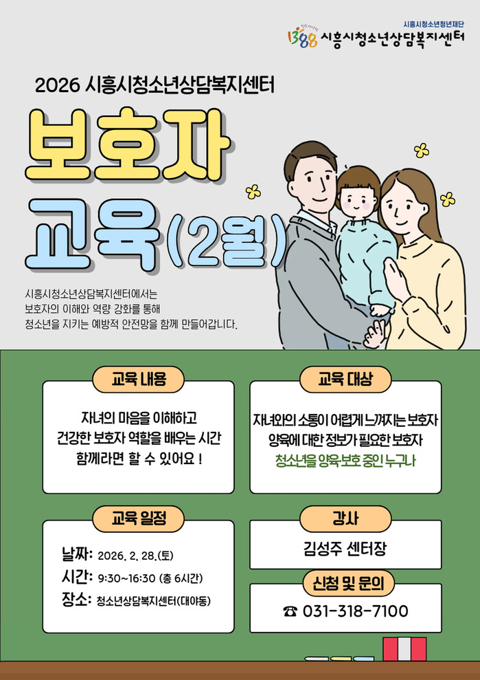 [시흥=송윤근 기자] 경기 시흥시청소년청년재단 산하기관인 시흥시청소년상담복지센터가 보호자의 이해와 역할 강화를 통해 청소년을 지키는 예방적 안전망을 구축하고자 2026년부터 보호자 교육을 정기적으로 운영하고 있다.
