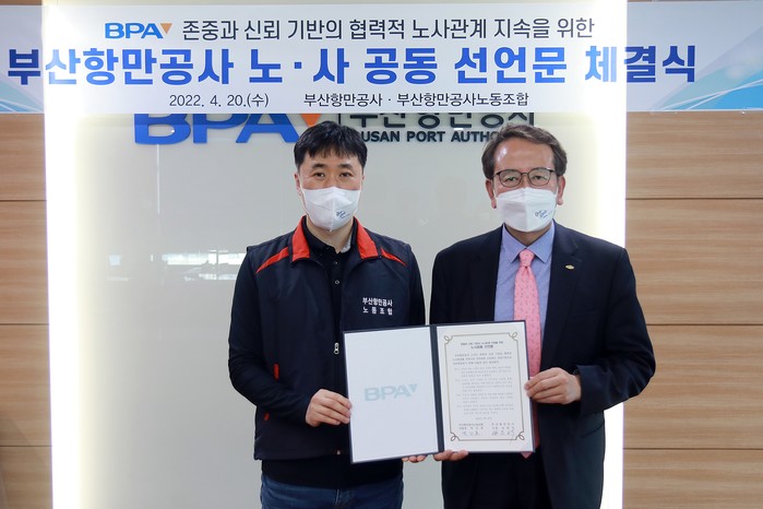 부산항만공사(BPA, 사장 강준석)와 부산항만공사 노동조합(위원장 박신호)은 20일 협력적 노사관계 지속을 위한 노사 공동 선언문을 채택했다.
