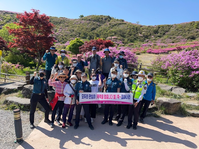 합천경찰서(서장 박정덕)는 22. 5. 6.(금) 08:30 ~ 10:30, 전국적으로 연 50만명이 찾는 황매산 철쭉 개화시기에 황매산 등산로 입구에서 합천가정상담센터와 함께 ‘모두의 관심이(폭력을 멈춥니다 철)쭉 피어나라’캠페인을 실시하였다.
