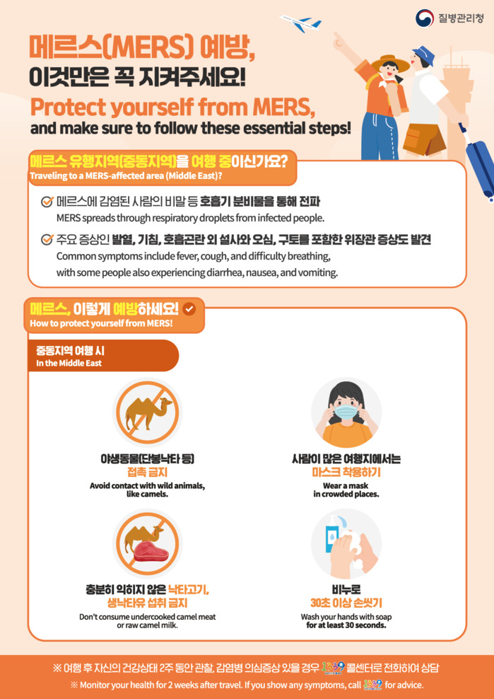 메르스는 국내에서는 지난 2018년 이후 발생 사례가 없으나, 사우디아라비아를 포함한 중동지역에서는 지속적으로 발생하고 있어 주의가 필요하다. 이에 따라 정부는 입국 시 중동지역 체류 및 경유자들은 전자 검역신고 시스템(Q-CODE) 또는 건강상태질문서 작성을 안내하고, 검역소에서는 발열 및 호흡기 증상이 있는 입국자를 대상으로 신속한 조사를 진행하는 등의 검역을 강화하고 있다.