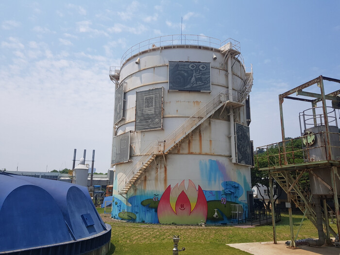 이번에 그래피티 작업이 진행된 놀이통은 이중 과거 가스저장소로 활용하던 공간이다. 외벽에는 방현우 작가의 대형 설치미술 작품이 배치되어 있는데, 수년이 지나며 곳곳에 녹이 슬었다. 이런 질감 위에 그래피티 벽화가 추가되면서 높이 17m, 지름 15m에 이르는 대형 가스통의 외벽이 그 자체로 거대하고 빈티지한 미술관이 됐다.