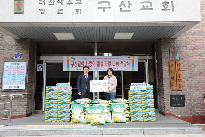 추수감사절을 맞아 구산교회에서는 따뜻한 마음과 정성을 모아 쌀 23포 460kg와 과일 30박스를 주민센터에 나눔했다. 교인들의 따뜻한 마음이 담긴 성품은 홀몸 어르신과 저소득 취약계층 등 주변의 어려운 이웃들에게 전달될 예정이다.