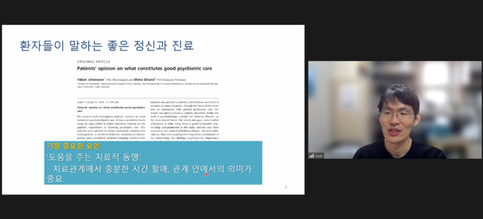 강의는 정신건강의학을 비판적으로 성찰하고, 치료의 주체를 새롭게 조명하는 흐름을 중심으로 구성됐다. 장창현 과장은 “정신과 의사는 질병과 약물에 대한 ‘지식의 전문가’이며, 당사자는 삶을 살아온 ‘경험의 전문가’라는 전제를 기반으로, 치료는 어느 한쪽 관점만으로는 완성될 수 없다”라고 강조했다.