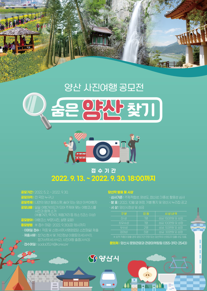 양산시는 올해 나만의 양산 힐링스팟, 숨어 있는 이색여행지를 소개하는 양산 사진여행 공모전‘숨은 양산 찾기’개최한다.