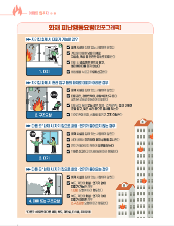 아파트 화재 시 무조건적인 대피보다는 불길과 연기의 유무를 살피고 신중히 판단하여 행동해야 한다.