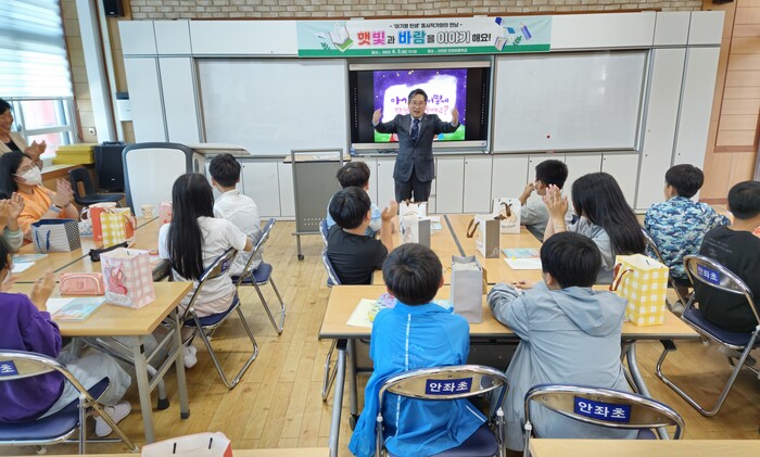 안좌초등학교 5~6학년 학생을 대상으로 한 간담회에선 ‘햇빛과 바람을 이야기해요’를 주제로 태양광, 해상풍력 등 재생에너지의 중요성과 필요성에 대한 이해를 넓히고, 재생에너지를 활용한 인구소멸 해법에 대해 함께 고민했다.