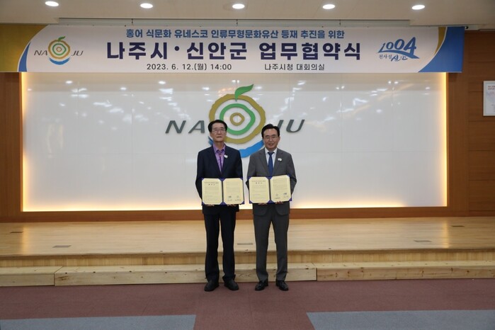 [신안=황승순 기자]신안군(군수 박우량)은 지난 12일 나주시(시장 윤병태)와 ‘홍어식문화 유네스코 인류무형유산 등재 공동 추진을 위한 업무협약’을 체결했다.