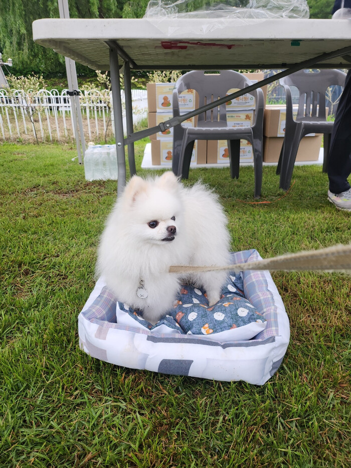 | ▲ 폐현수막으로 제작한 반려동물 쿠션 위에 있는 애완견 /사진제공=시흥시 |